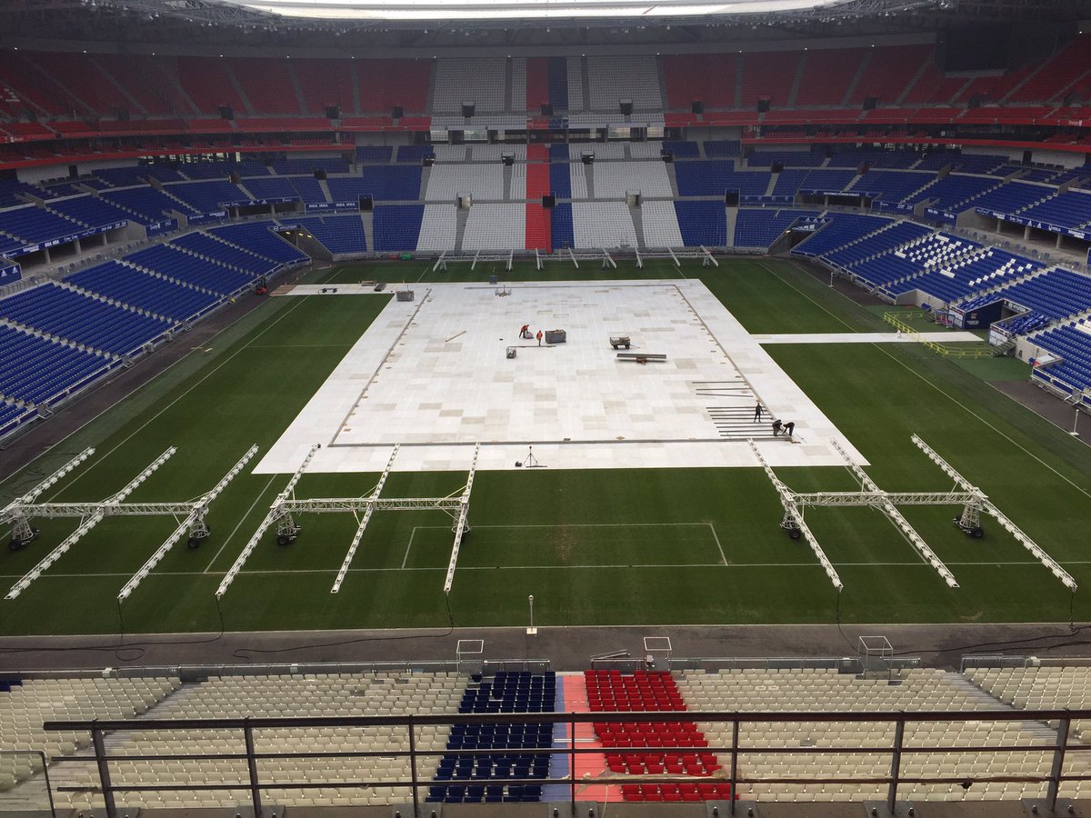 Les protections de la pelouse ainsi que le plancher de la patinoire ont été posées Le montage de la patinoire, en tant que telle, s'organise ensuite en plusieurs étapes. D'abord la pose du tapis glacier, achevée lundi, ensuite la mise en place des rambardes, effectuée ce mardi. De son côté, la glace commence à être monté depuis lundi soir. L'opération se poursuivra jusqu'à jeudi. Enfin, touche finale, les sponsors et lignes seront disposées.