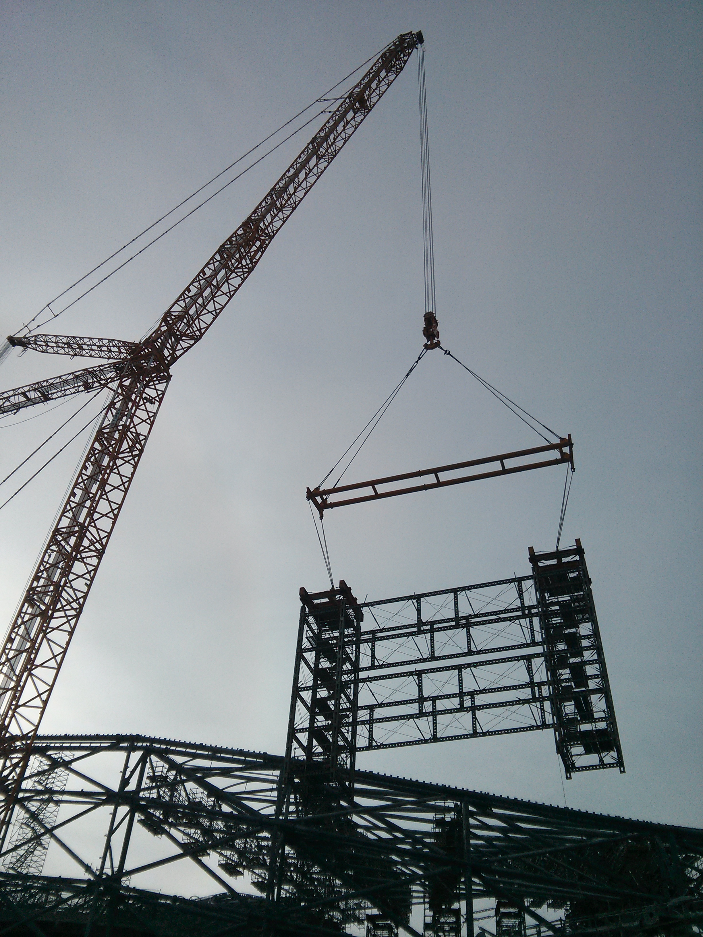 Reprise de la grue Médiaco à l'intérieur du stade virage Sud ça sent bon le coffrage d'un futur socle de palée ...