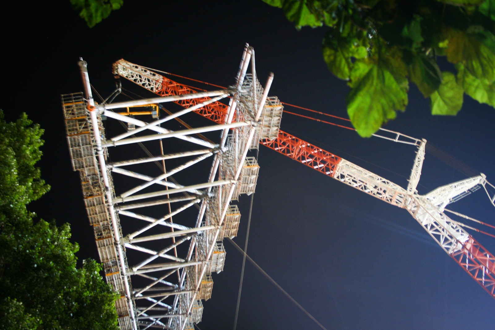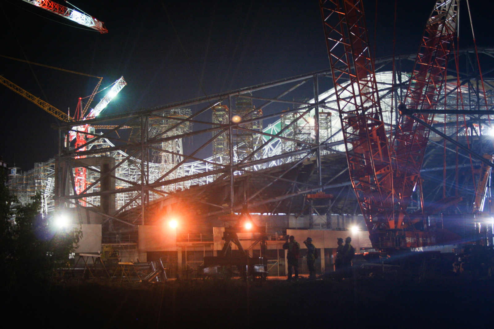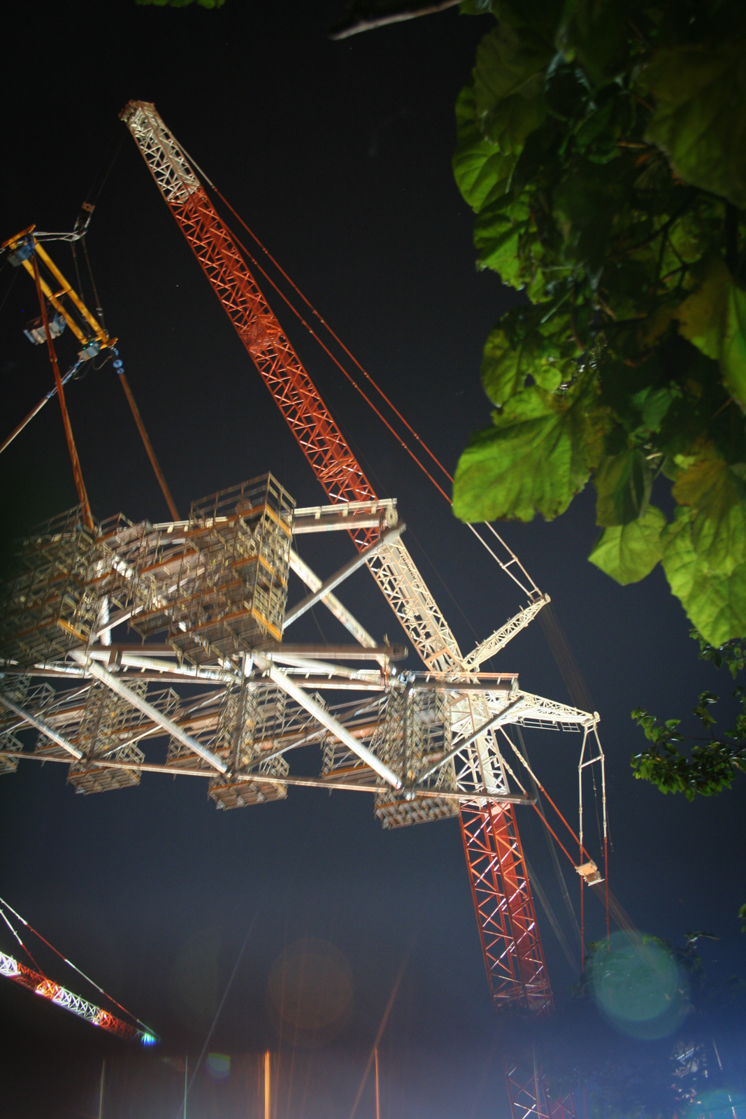 C'est toujours impressionnant de se retrouver là dessous, et la nuit donne une ambiance encore plus particulière. J'ai pu suivre tous les préparatifs d'avant levage, le bruit des vérins qui ajustent les élingues au centimètre près, le moteur de la LM qui se met en route, le colis qui craque dès qu'il se détache de sa station, et les ouvriers qui s'activent pour guider au mieux ce monstre métallique avec leurs cordes.