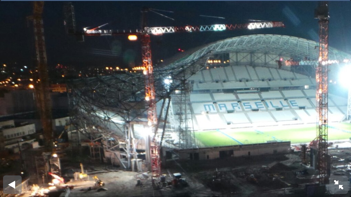 Pour la dépose des socles béton l'extraction se fait avec une grue mobile depuis l'intérieur du stade (même technique que Ganay).