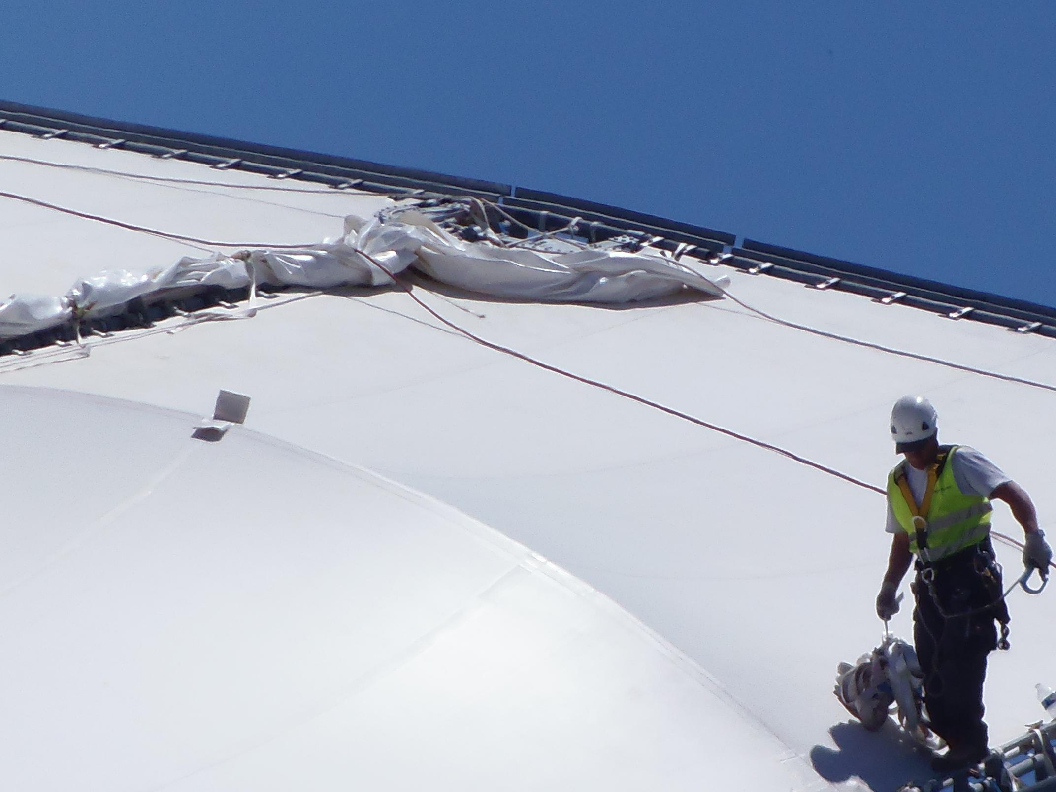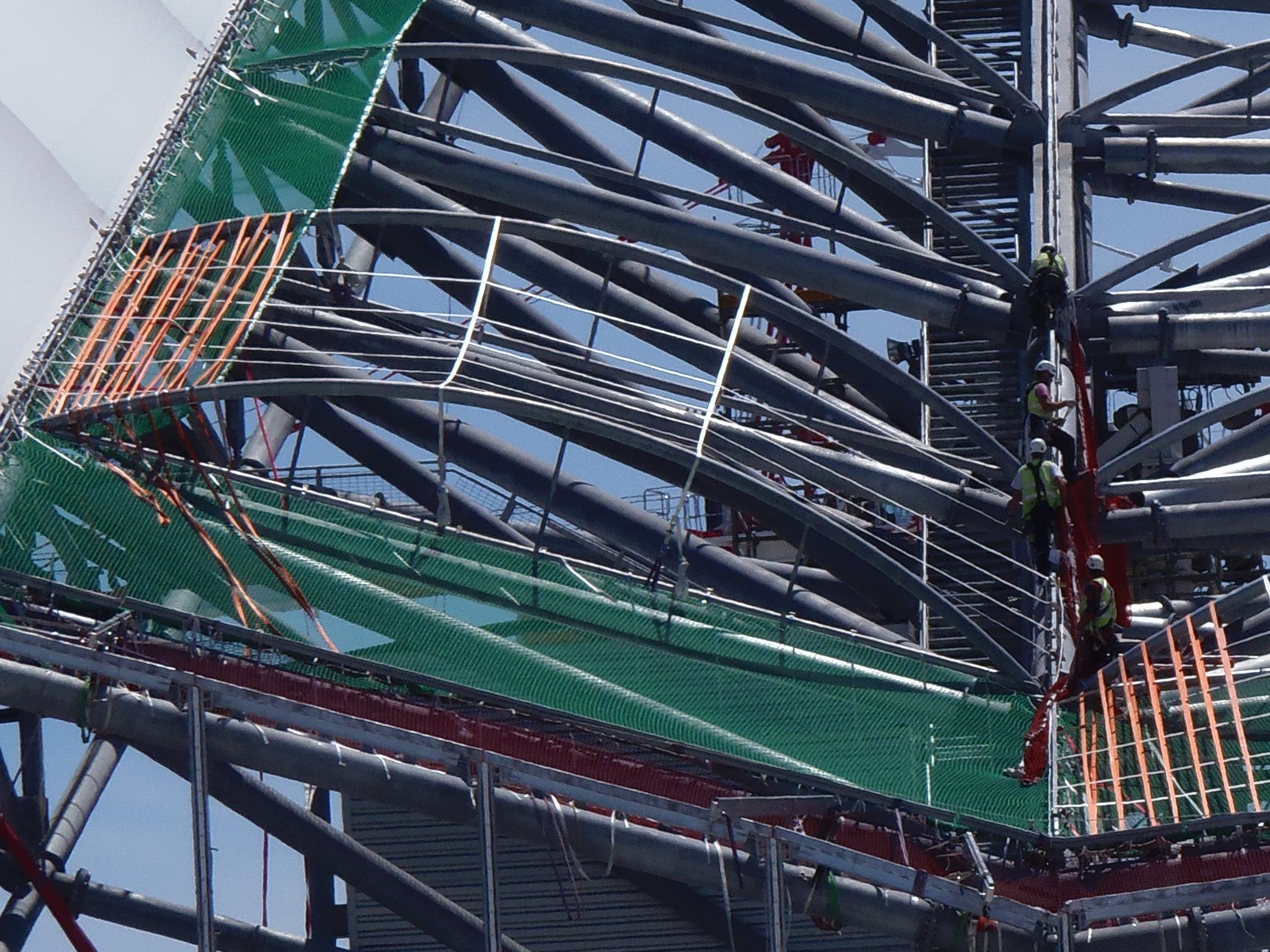 vers les 34 sec de cette derniere nous voyons les ouvriers montant en hat de Ganay par les passerelles, ces derniers sont plus haut que la toile ( environ 50 cm ) d'ou ma question, pensez vous qu'a ce niveau la toile sera " bombée " pour permettre au futur technicien de pouvoir se deplacer debout ? en effet si la toile est raccorder a la meme hauteur que les lées , il me semble que leur deplacement se fera de maniere difficile ( il devront etre vouté pour emprunter les passerelles )
