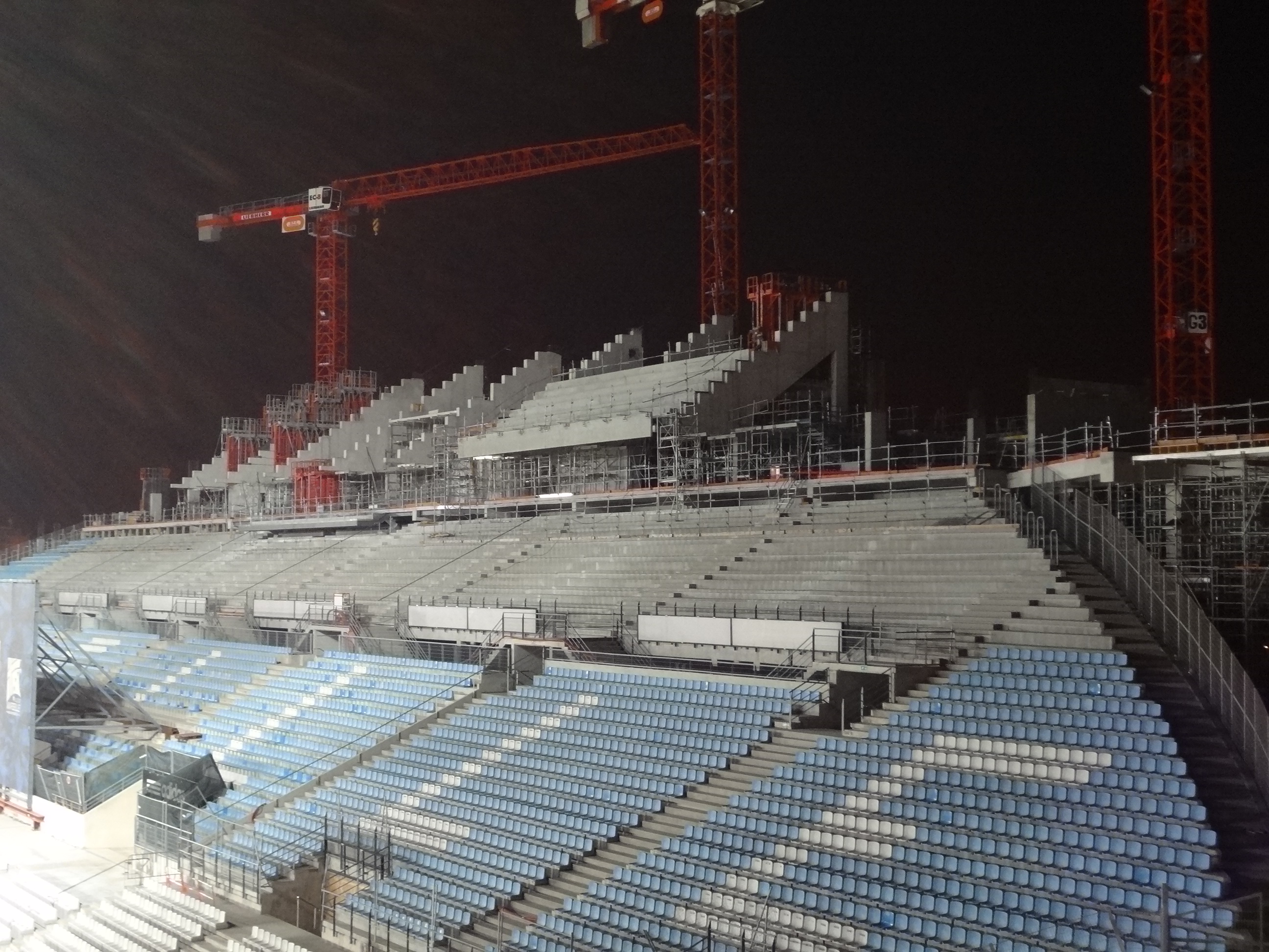 D'ici aux prochaines photos (mercredi je suppose), je pense qu'on verra pas mal de changements. On peut avoir l'impression que ça avance doucement mais au niveau R+5 il y a des escaliers et les accès à la partie haute de la tribune à faire.