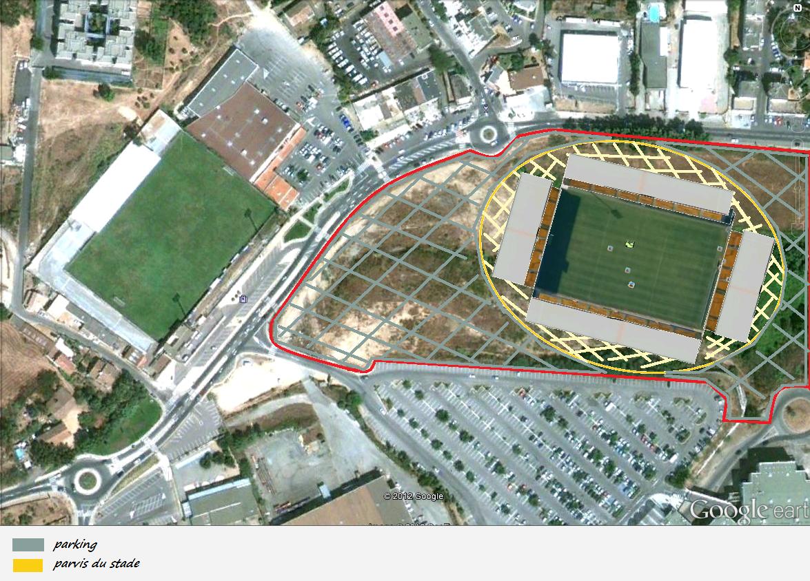 En prenant la vue aérienne de la zone d'implantation du stade du gazelec, et en prenant les parties ( juste basse de bollaert + toiture) en guise d'exemple , voici un apercu virtuel d'un stade , juste en face de l'ancien , avec parvis et parking