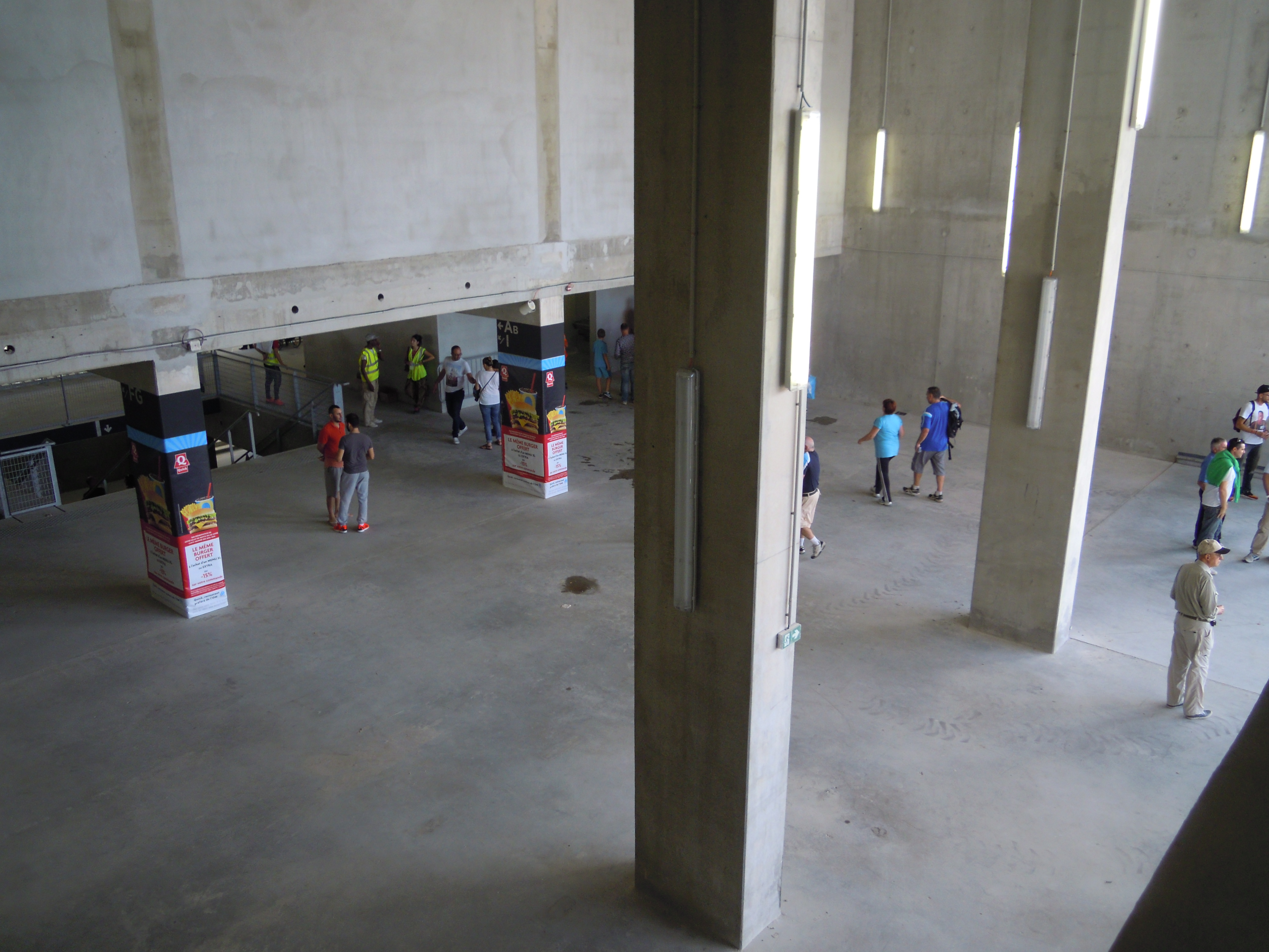 Je me suis honnêtement senti très ému face à ça je ne peux pas expliquer pourquoi mais tu te retrouves con au milieu d’un lieu splendide. Extraordinaire, spectaculaire, magique, merveilleux les mots me manquent… Bref l’intérieur du stade est tout simplement MAGNIFIQUE ! L’imposante charpente en acier ne choque absolument pas et s’intègre parfaitement en participant à la beauté de l’ensemble. Le toit est tout simplement grandiose avec une forme qui sublime le tout.