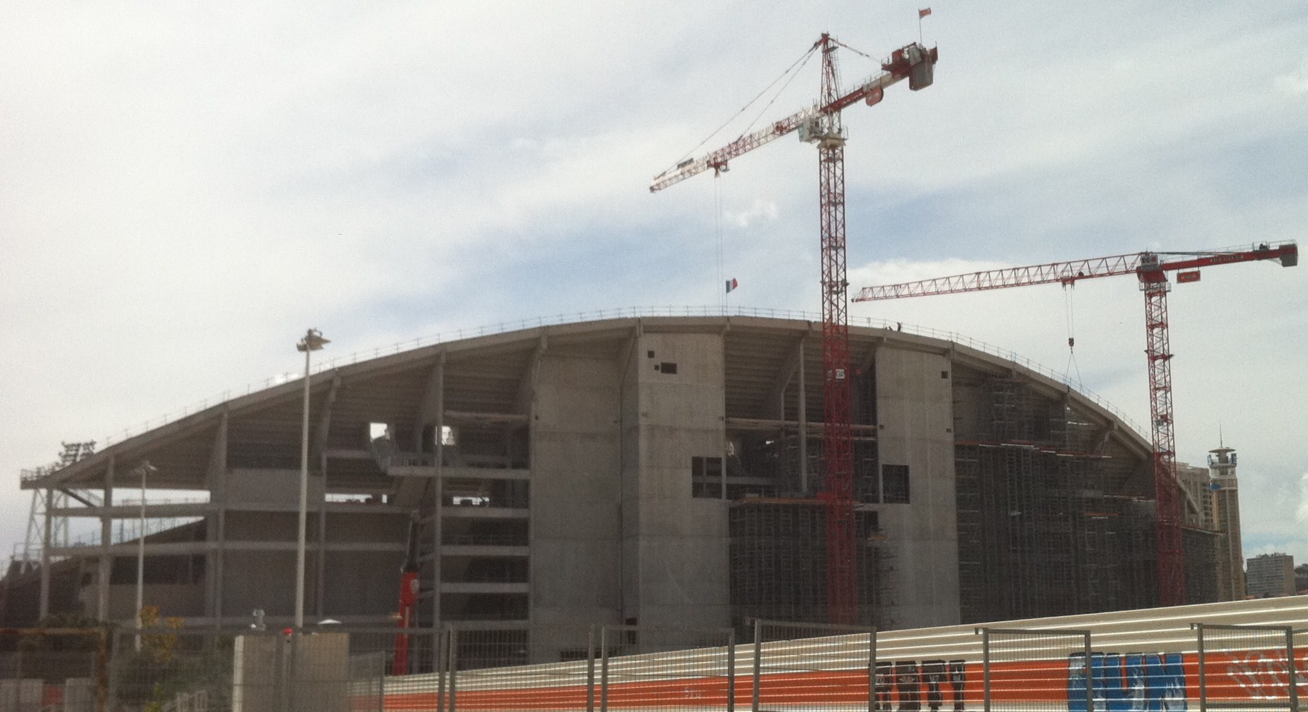 Voila une photo vite Fait Vers 16h, avec une des dernières pose de gradin ainsi on remarque que la dépose des tours d’étaiement vont bon train au niveau des crémaillères 9 et 10.