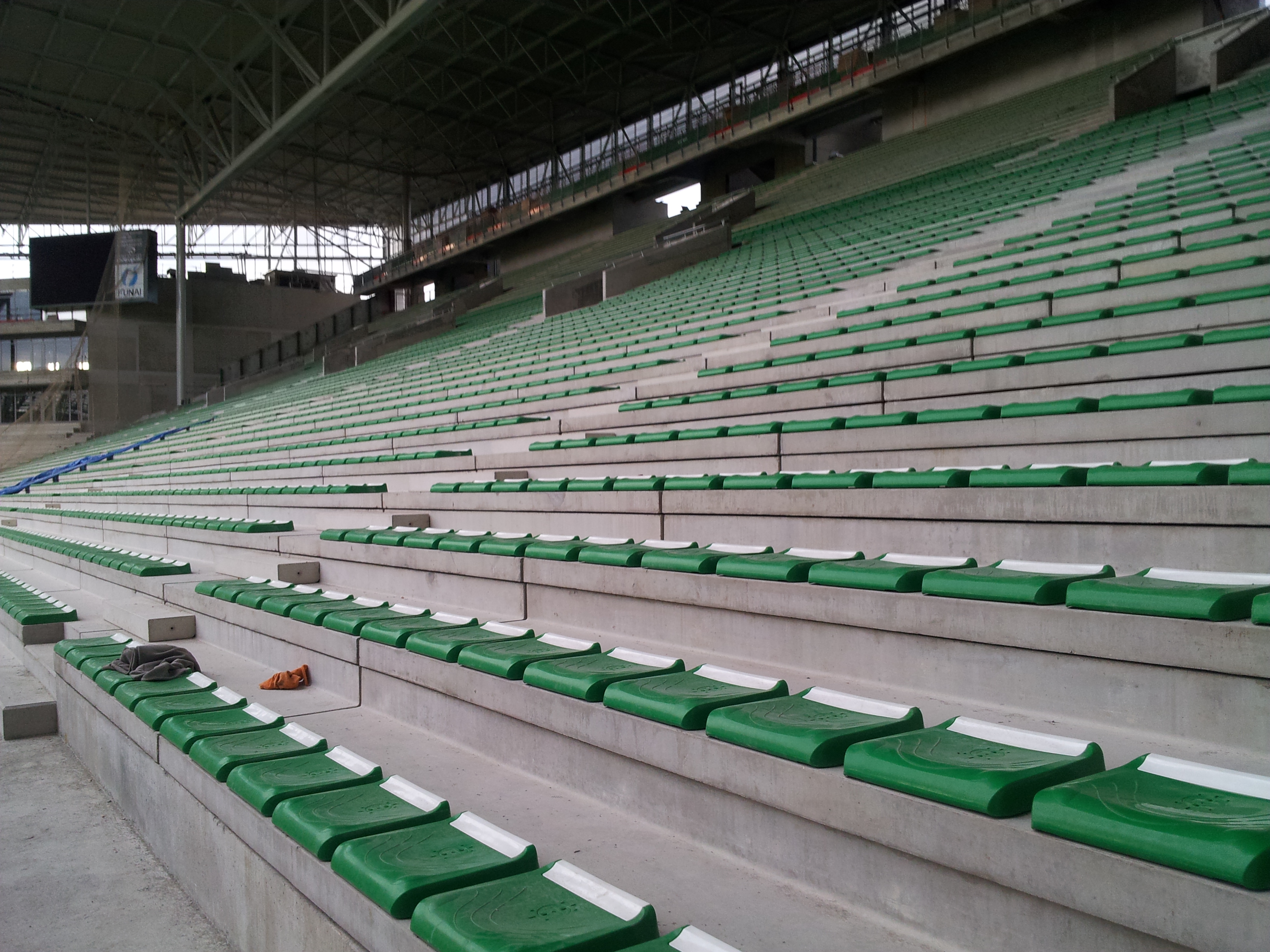 Deux ou trois autres photos. On peut voir que la pose des sièges est bien entamée. La grille devant le Kop est bien en deux parties rabattables. Désolé pour la qualité, elles proviennent de mon portable.