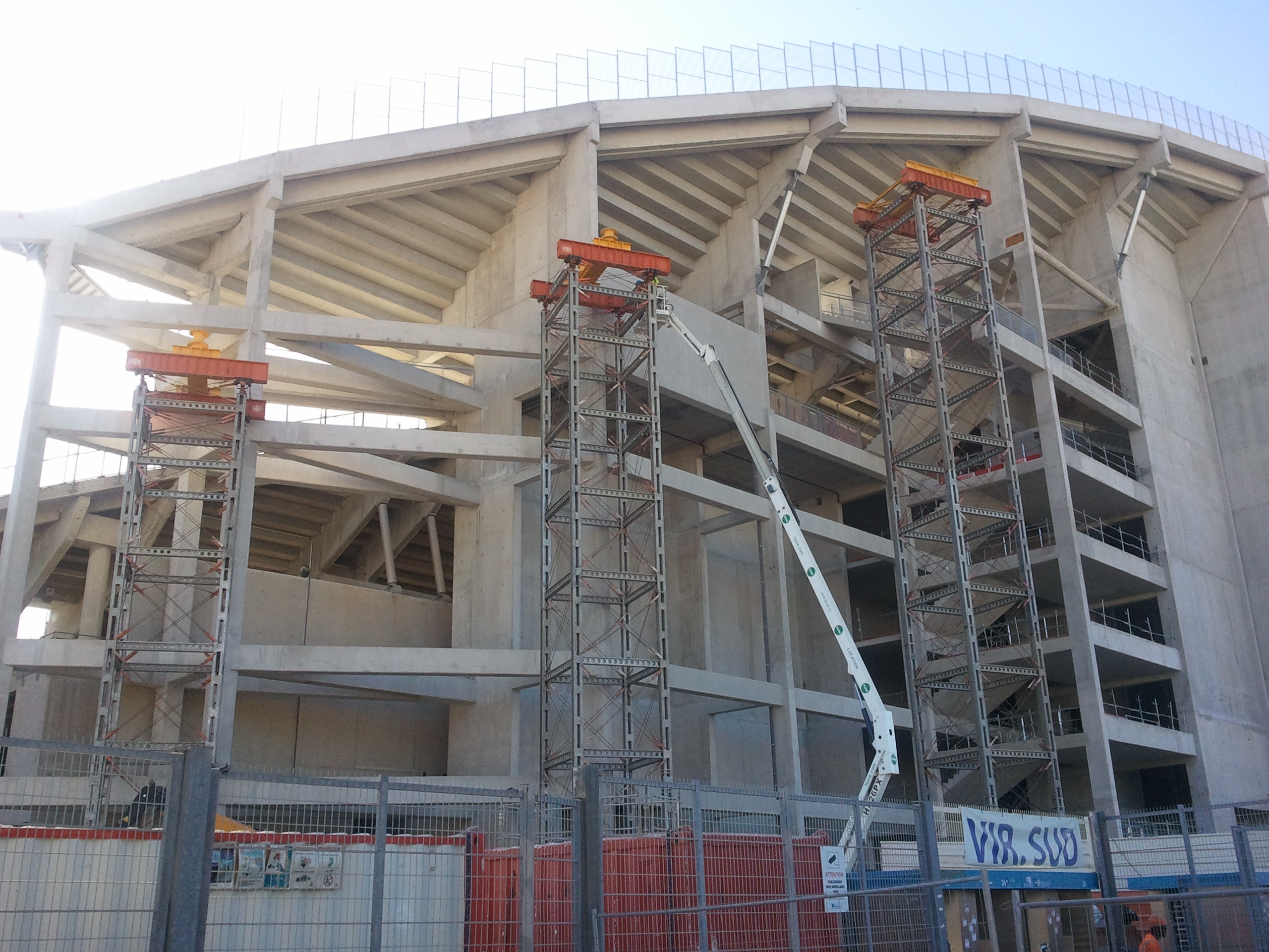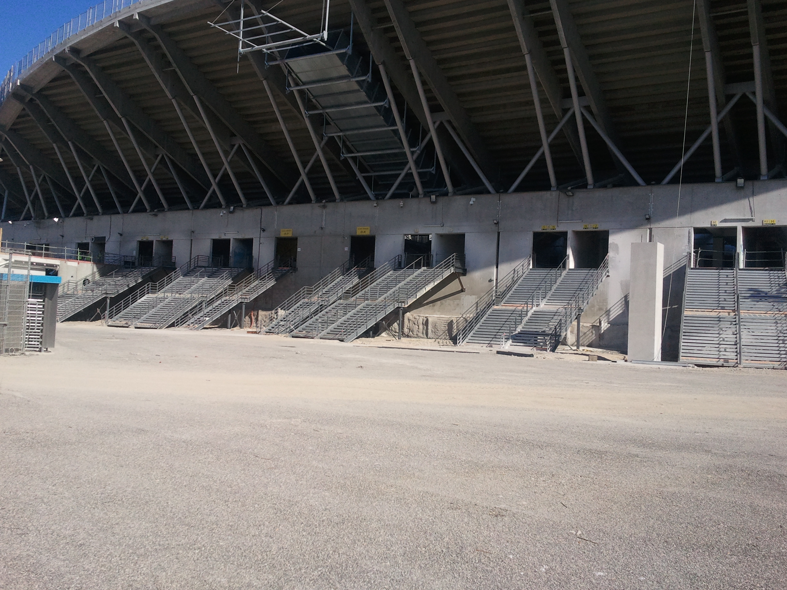 Petite question : les palées serviront donc de soutien pour la jupe du toit, ok. Mais, je suppose que la jupe ne va pas démarrer à partir de ces palées ? D'o^partira-t-elle dans ce cas ? En fait, je pensais au départ que des éléments de la charpente seraient directement fixés sur la paroi du stade pour servir de point d'encrage. Mais, au regard du peu d'espace entre la paroi et les palées, ce ne sera pas le cas.