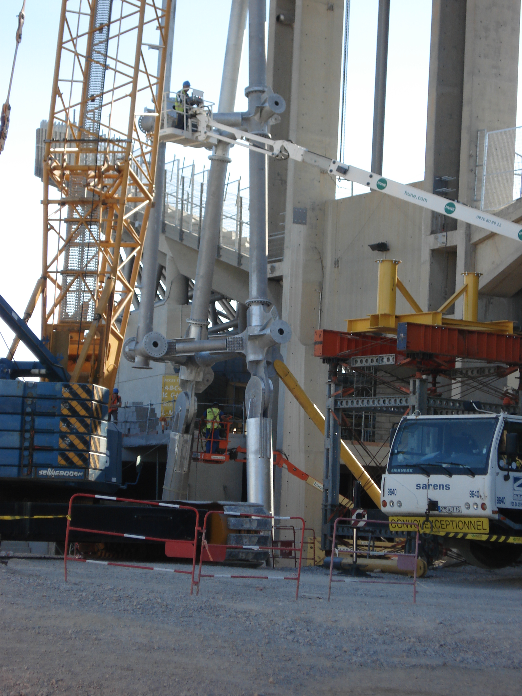 Pour ce premier élément, appelé radiale, le processus de montage est particulier. La première radiale positionnée est celle qui se trouve au dessus de l’angle sud-est. Pour celle-ci, il n’y a pas de palée provisoire, elle est directement connectée à deux platines qui se trouvent dans le massif du méga-poteau. Ensuite sur ces platines sont fixées des pieds de jupes sur lesquels la radiale va venir poser.