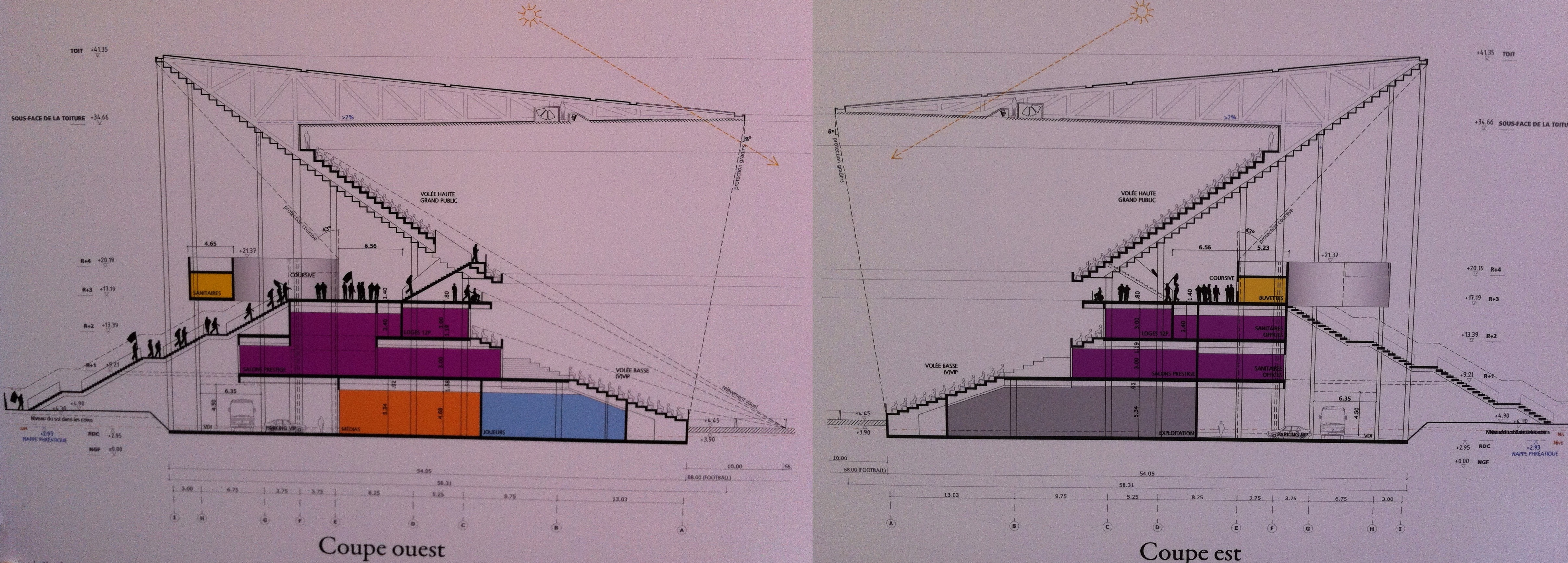Grand public : tribunes est/ouest (4 escaliers pour chaque tribune vers coursive en R+3)