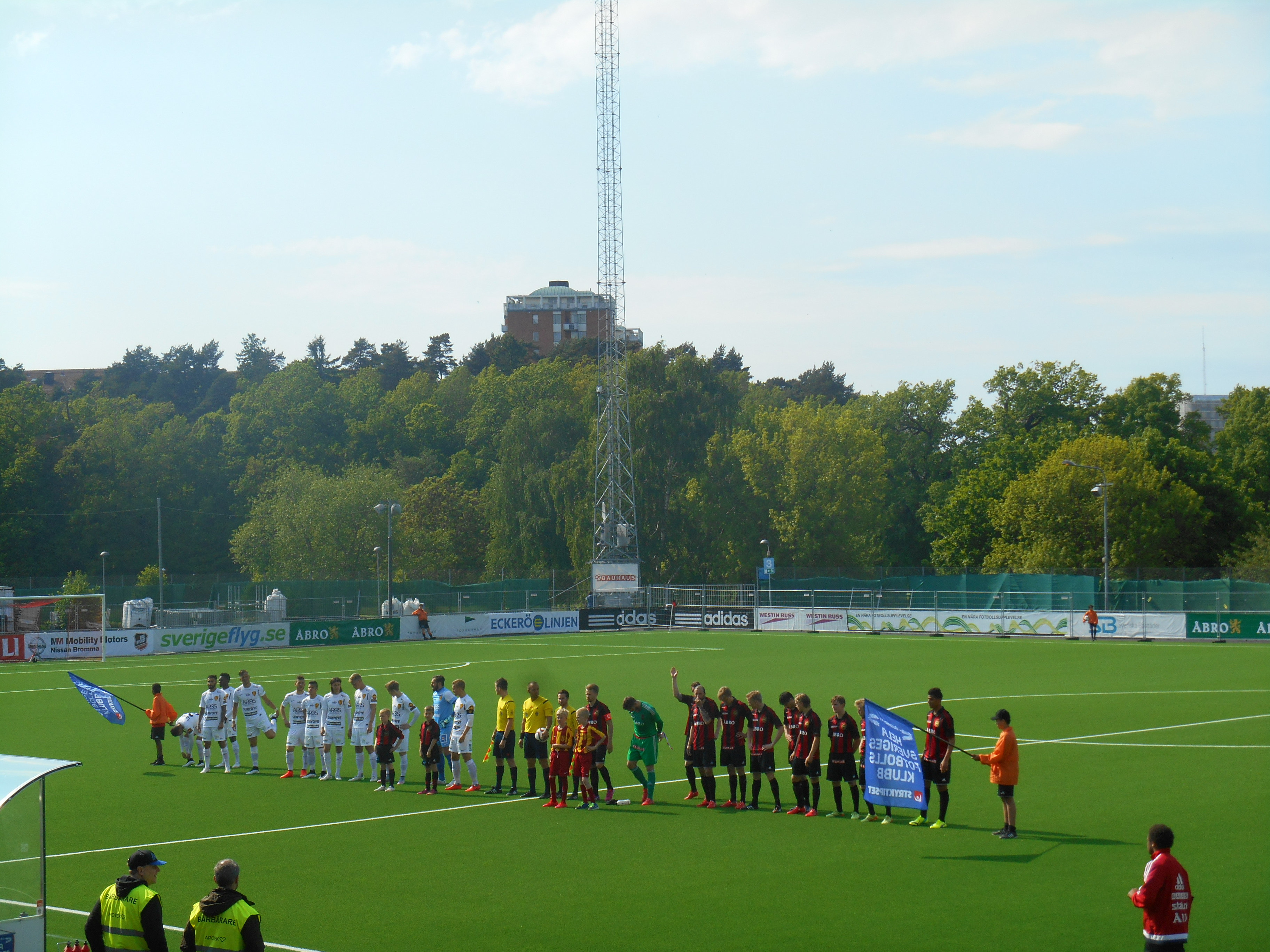 Il faut dire ce qui est, c'est du niveau amateur quasiment (équivalent d'une bonne CFA type GF38 en France) et pourtant, c'est de la deuxième division professionnelle. Lorsque l'on sait que l'équipe de Brommapojkarna a jouée et passée 2 tours préliminaires d'Europa League en 2014 (Sortie par le Torino 0-3 4-0) en étant sélectionné au Fair-Play, on se dit que les premiers tours de coupe d'Europe ne doivent pas attirer les foules. L'équipe a le mérite d'essayer, de jouer mais c'est terriblement faible en défense, et immobile en attaque (à l'image de leur attaquant de pointe qui n'a fait que dévier les ballons de la poitrine durant TOUT LE MATCH). Le but des visiteurs survient en fin de 1ère mi-temps débordement côté gauche, centre, belle extension du 9 et but de la tête, poteau rentrant (photo). Bonne poussée des locaux en fin de match, mais trop faible pour espérer quoi que ce soit. Pas une grande expérience.