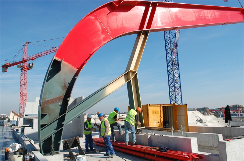 Les travaux, réalisés sous la direction de l'opérateur Sogea, filiale de Vinci Construction France, associé à Norpac, filiale de Bouygues Construction France, sont assurés pour l'ensemble des terrassements, fondations spéciales, gros oeuvre, charpente, couverture, étanchéité et menuiseries extérieures. La société Victoire est mandataire avec Sapiso des cloisons et menuiseries intérieures. Caronor (mandataire) avec MPK, Brackman et Eurodeco, est chargé des revêtements de sols et murs, de la peinture et de la signalétique. L'entreprise Loison doit réaliser la métallerie et Satelec, avec MQB, devrait s'occuper des lots techniques. Ramery TP avec ISS Espaces verts sont chargés des aménagements extérieurs.