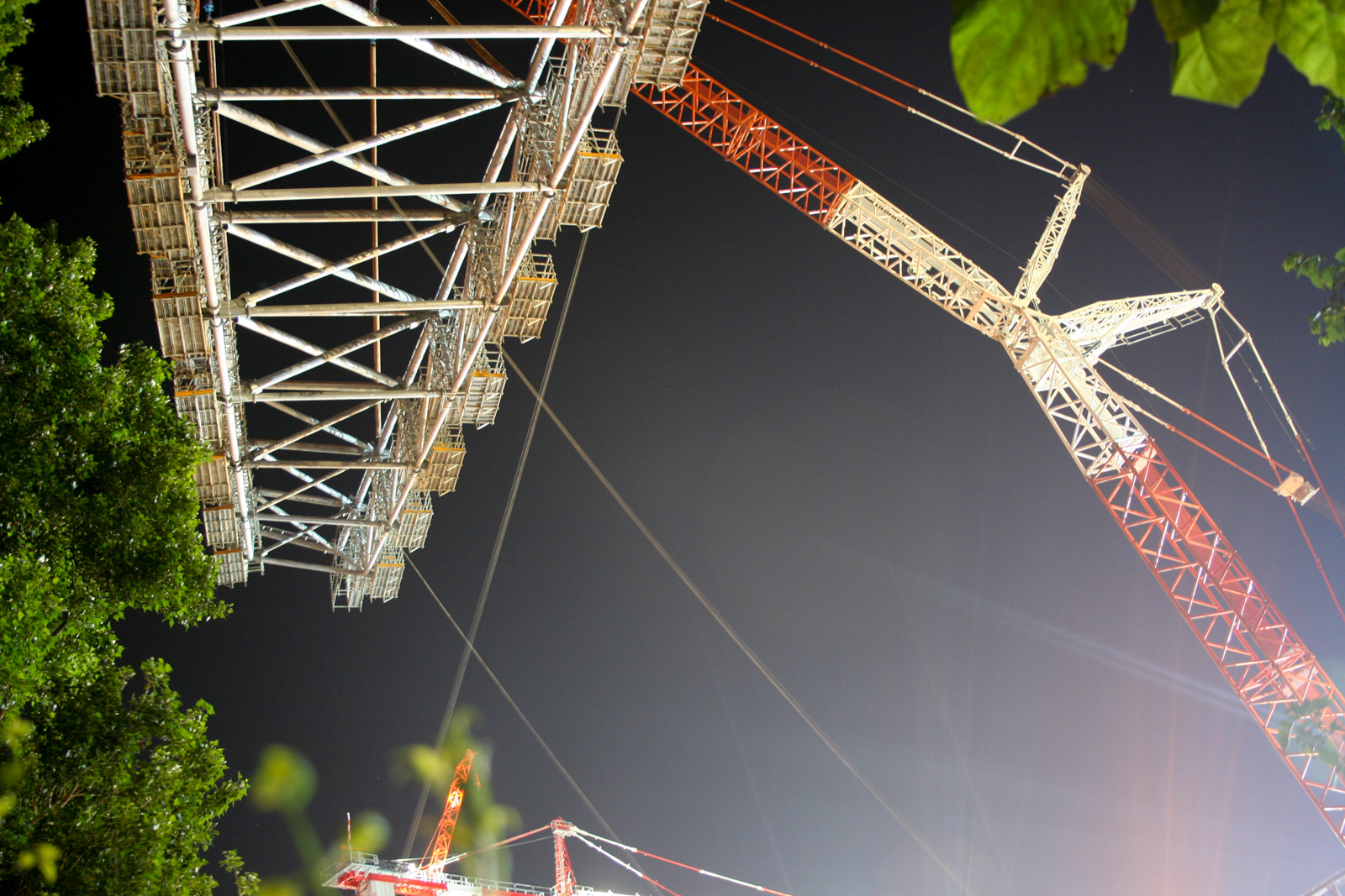 C'est toujours impressionnant de se retrouver là dessous, et la nuit donne une ambiance encore plus particulière. J'ai pu suivre tous les préparatifs d'avant levage, le bruit des vérins qui ajustent les élingues au centimètre près, le moteur de la LM qui se met en route, le colis qui craque dès qu'il se détache de sa station, et les ouvriers qui s'activent pour guider au mieux ce monstre métallique avec leurs cordes.