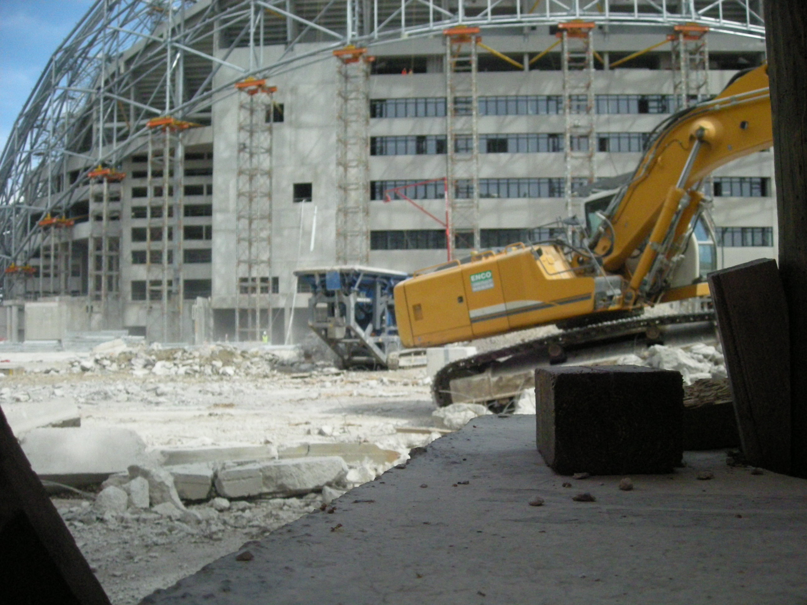 Voir la photo de yeye13 du 29 mars à 23h29 :Difficile à vérifier mais on dirait que les restes de radier sont concassés avant d'être enlevés ou ... étalés.