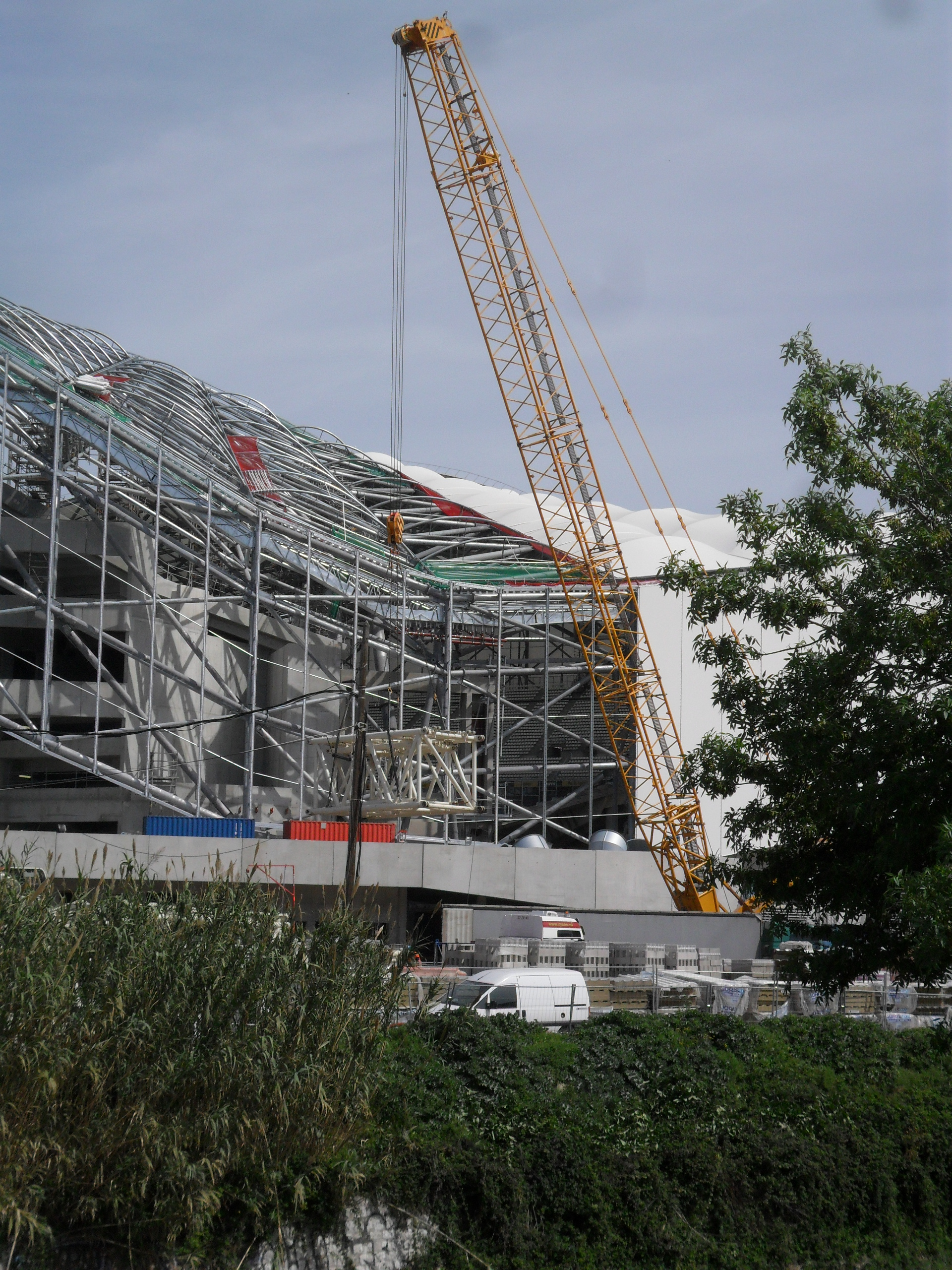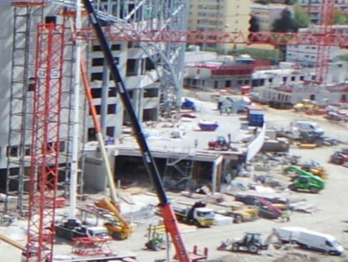bref ils bossent beaucoup au niveau des câbles qui forment des croisillons sur toute la hauteur des palées, visiblement ils sont en tension, l'ouvrier dans la nacelle travaille dessus, ils les détend visiblement, ensuite les grues mobiles viennent accrocher la palée, pas en haut, deux ou trois mètres plus bas
