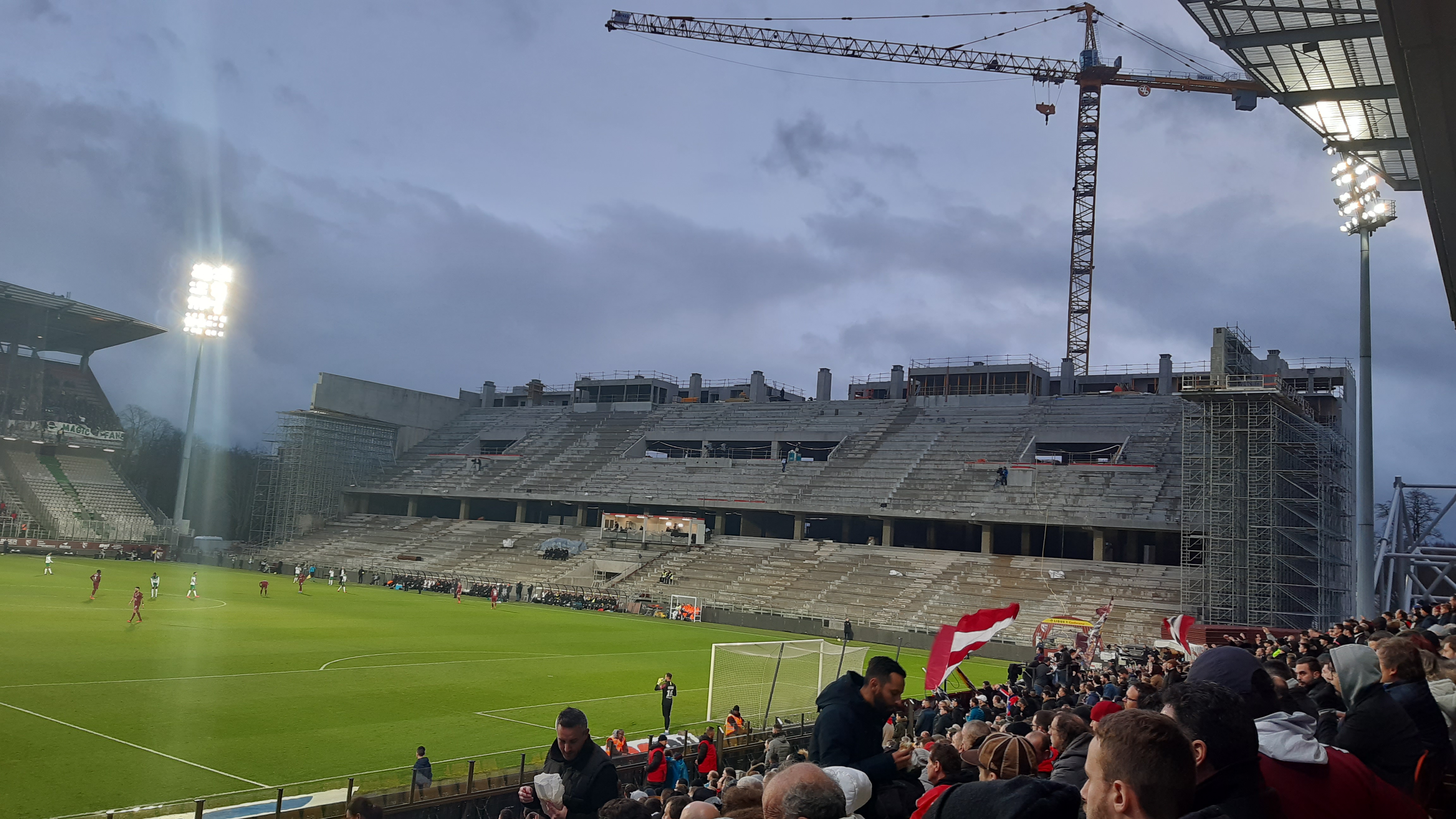 Tribune Sud le 28/01/2020, on peut voir entre l'angle de la Sud et de la Est (à gauche de la photo pour ceux qui ne connaissent pas) la charpente qui continue d'être assemblée au sol.