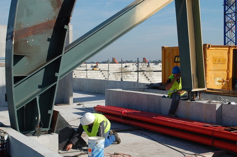 Pourquoi les structures en acier supportant le stade ne sont pas toutes peintes en rouge ? La peinture est faite après la pose !? ???