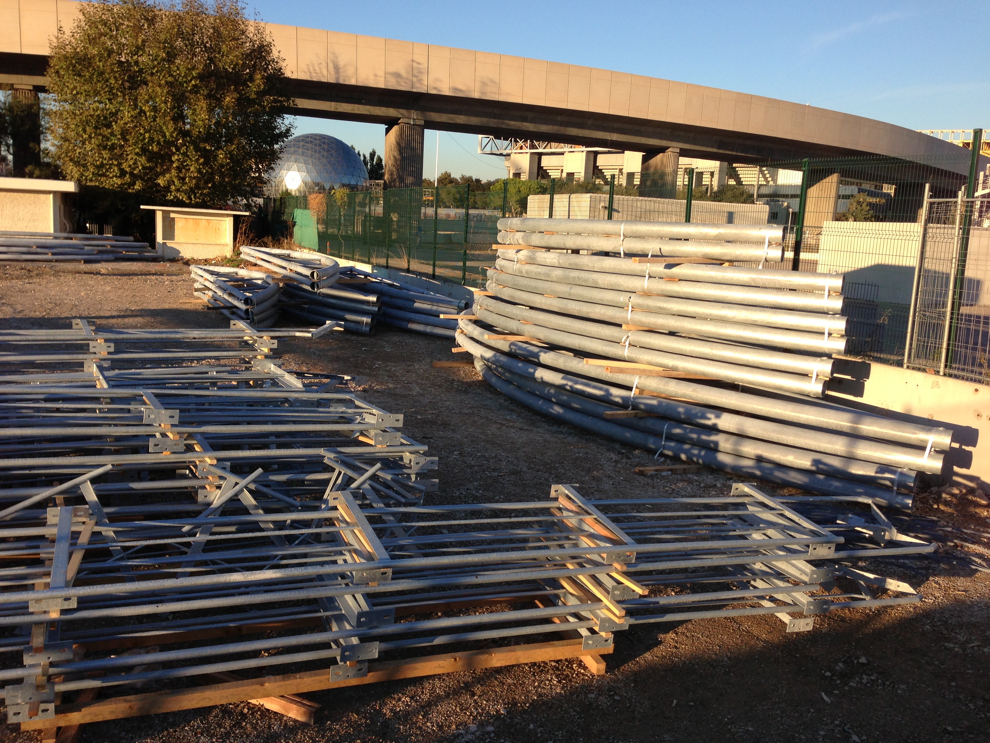 Dernière série avec 2 photos montrant du matériel stocké sur le parvis du stade Delors avec des gardes corps pour les accès aux tribunes et des arceaux pour les prochains colis de charpente.