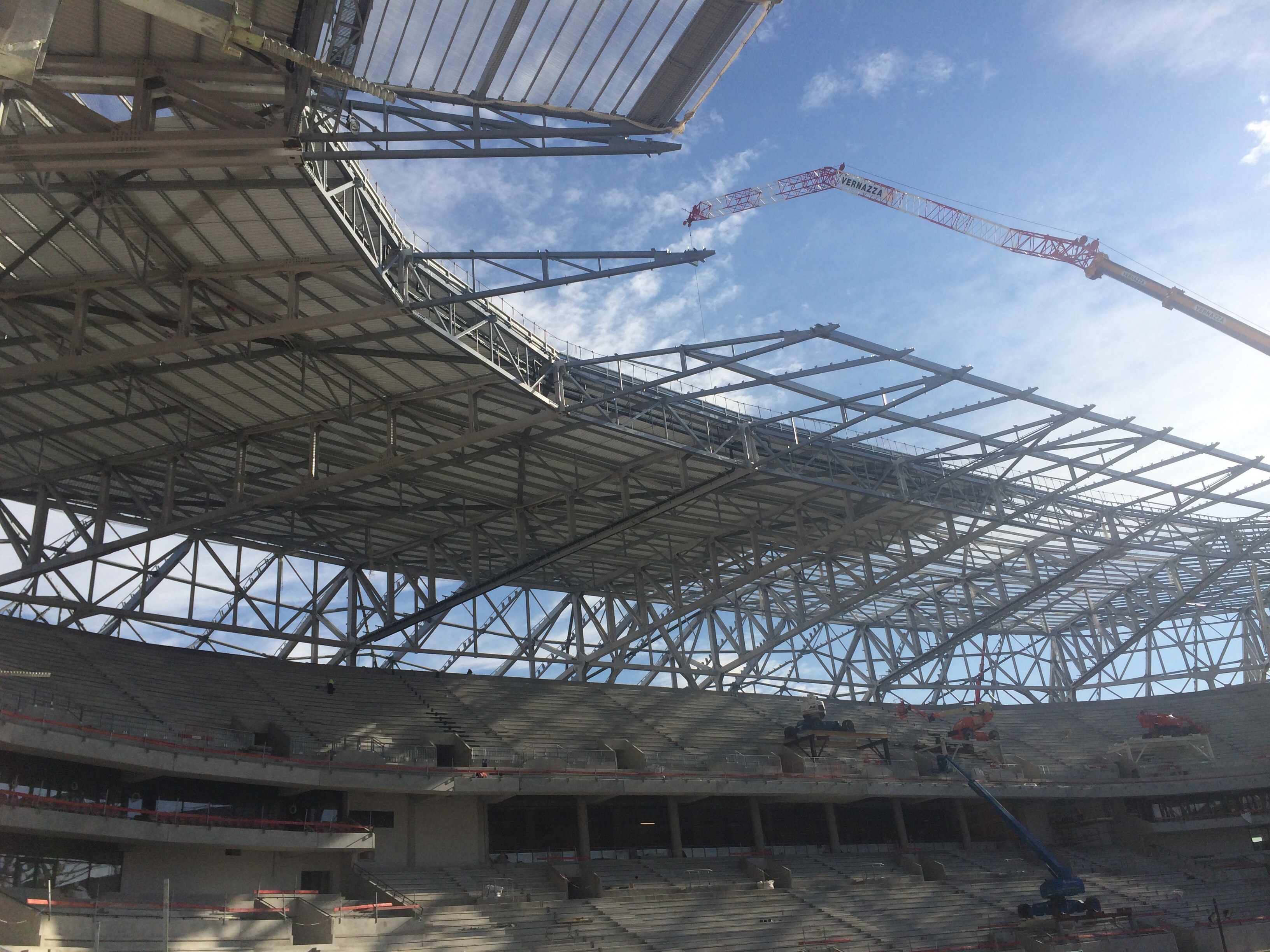 Sur la première photo on voit que le garde corps des mini escaliers du troisième anneau vient polluer la vue que l'on peut avoir sur la surface de jeu. Alors normalement la ligne de but devrait être bien visible mais j'ai quand même de sérieuses interrogations sur le 100 % visibilité garantie pour l'intégralité des sièges. Car j'imagine que si la photo avait été prise un peu plus basse, au milieu de la tribune, la gêne aurait été encore plus importante.vinc31 a écrit :Intérieur du stade