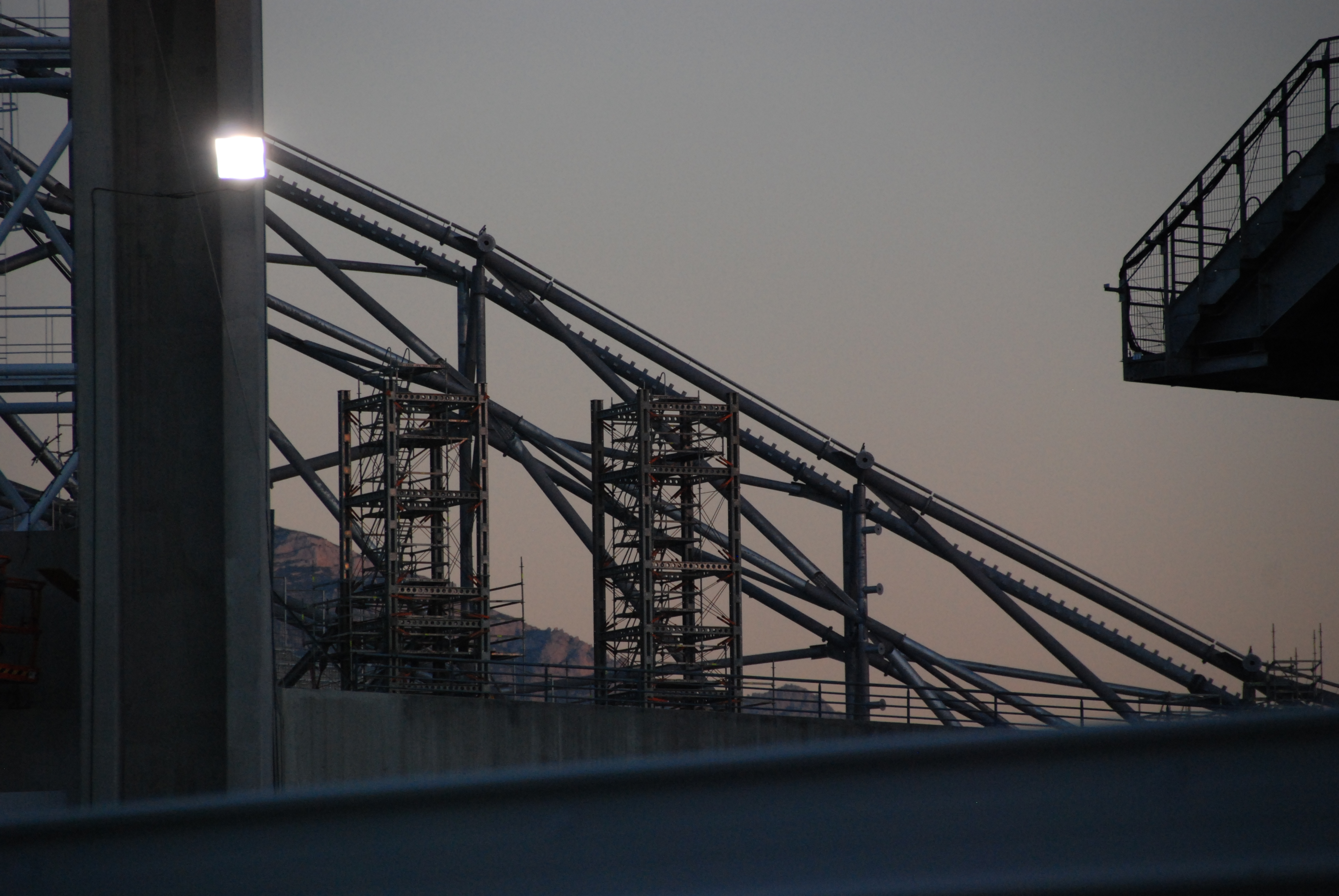 C'est exact !!! On voit bien les supports jaunes en haut des palées.WhoDog a écrit :La double palée vers le Virage sud serait donc le dernier étage des palées, celui qui supportera directement le toit, non ?