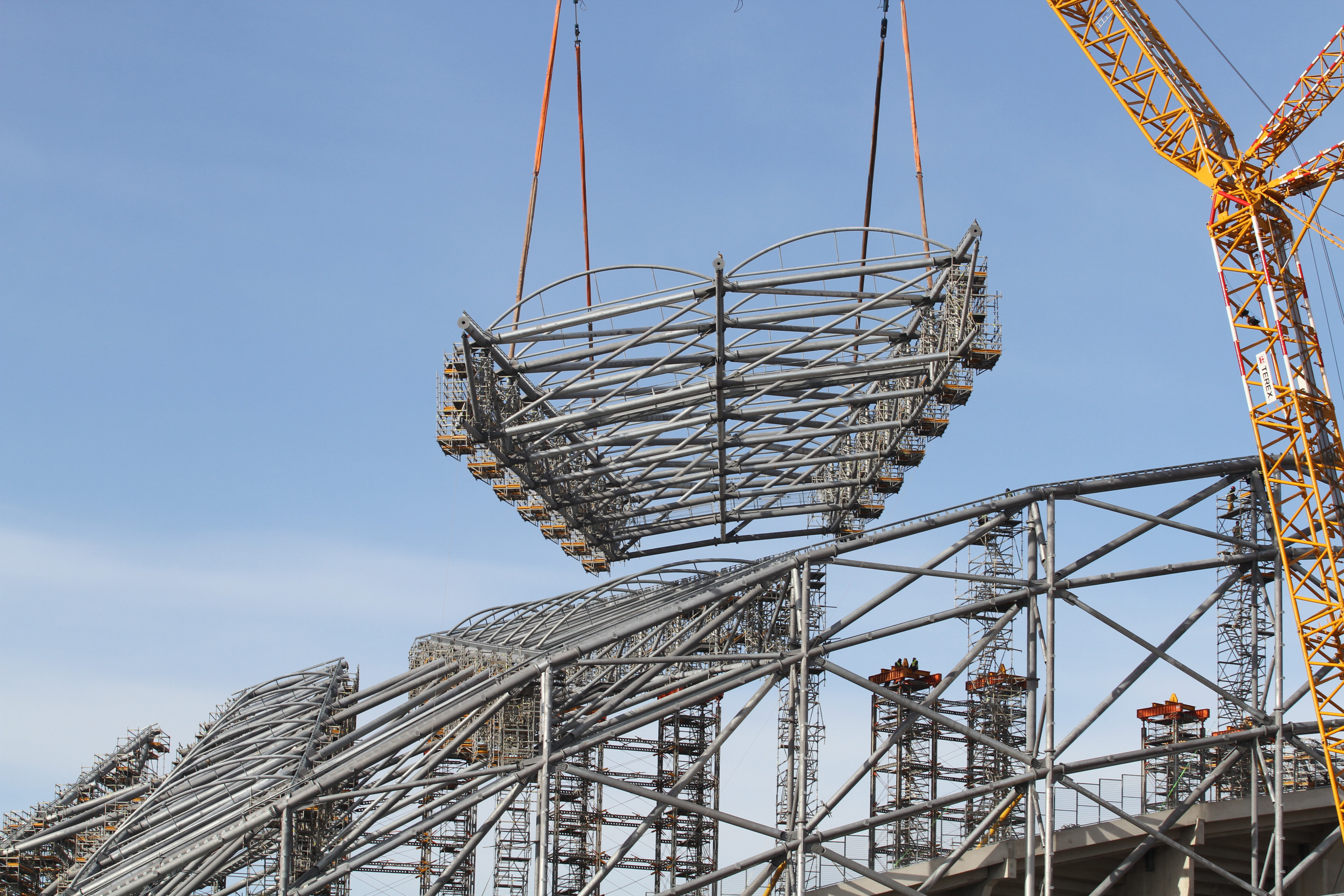 J'ai rajouté une flèche sur une photo de Def où l'on voit un ouvrier perché sur une palée, ça donne une idée du gigantisme du colis. N'oubliez pas de cliquer pour zoomer.