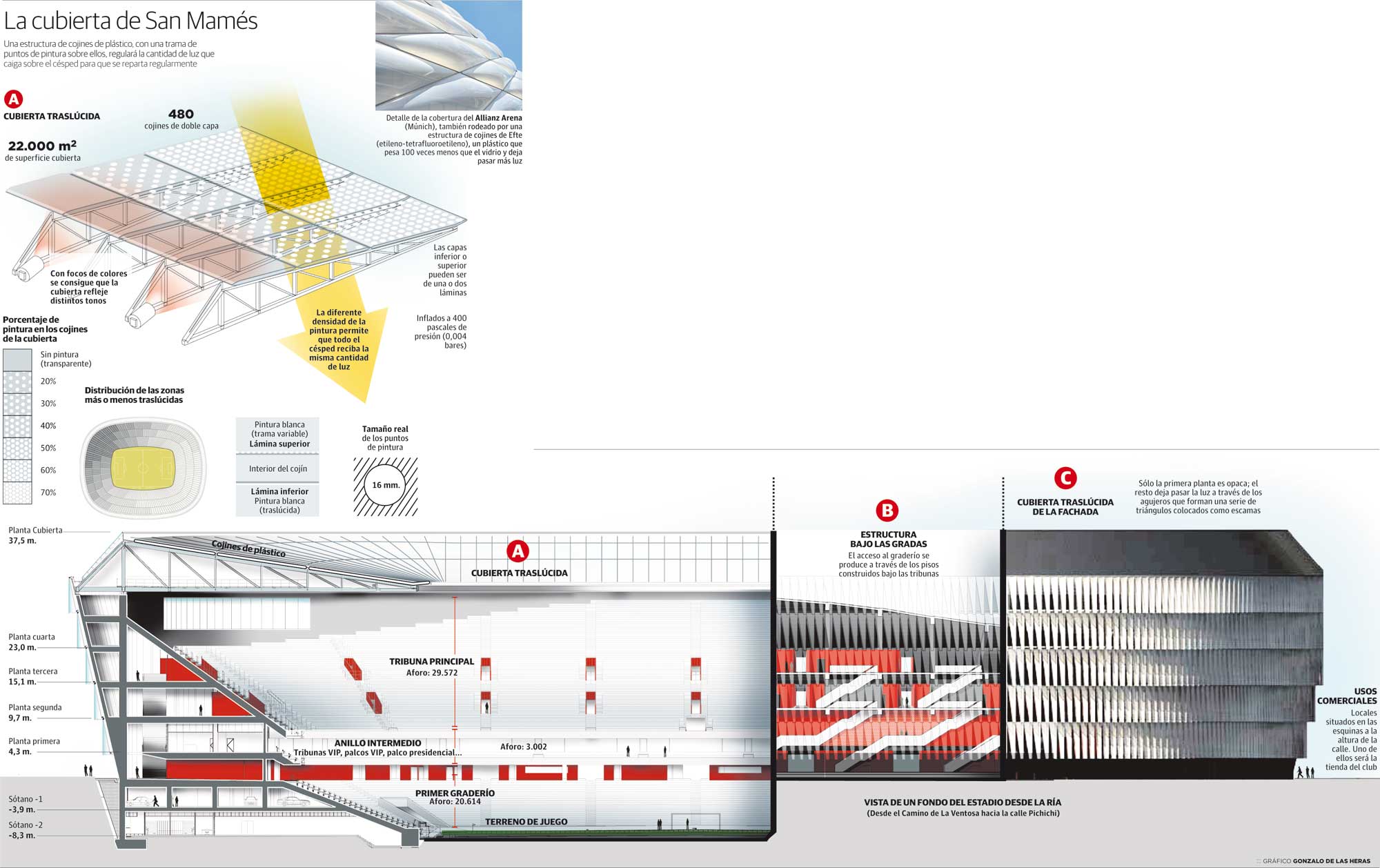 Comme on le voit sur le schéma ci-dessous, la partie manquante (à droite des pointillés rouge) sera rajoutée à l'été 2013, après destruction de la grande tribune principale de San Mames. Cela permettra d'y ajouter les quelques mètres carrés de terrain manquants et la tribune provisoire.