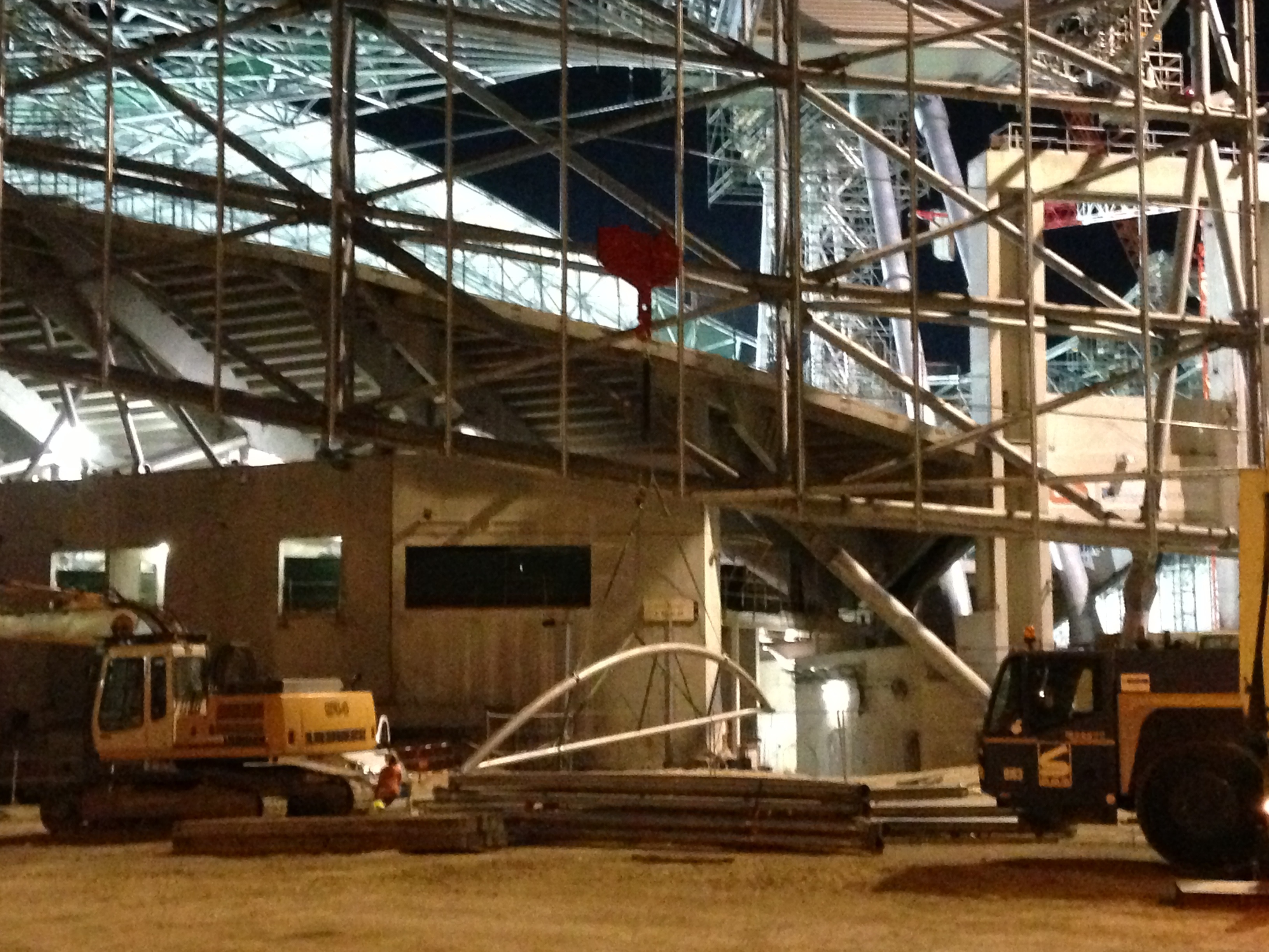 Il y a eu pas mal de poses d'arceaux côté VN mais il me semble qu'el en reste encore qques uns au sol sur la parvis nord. La LR 1750 a bien bossé elle aussi avec des poses de contreventements et ça continue encore ce matin.