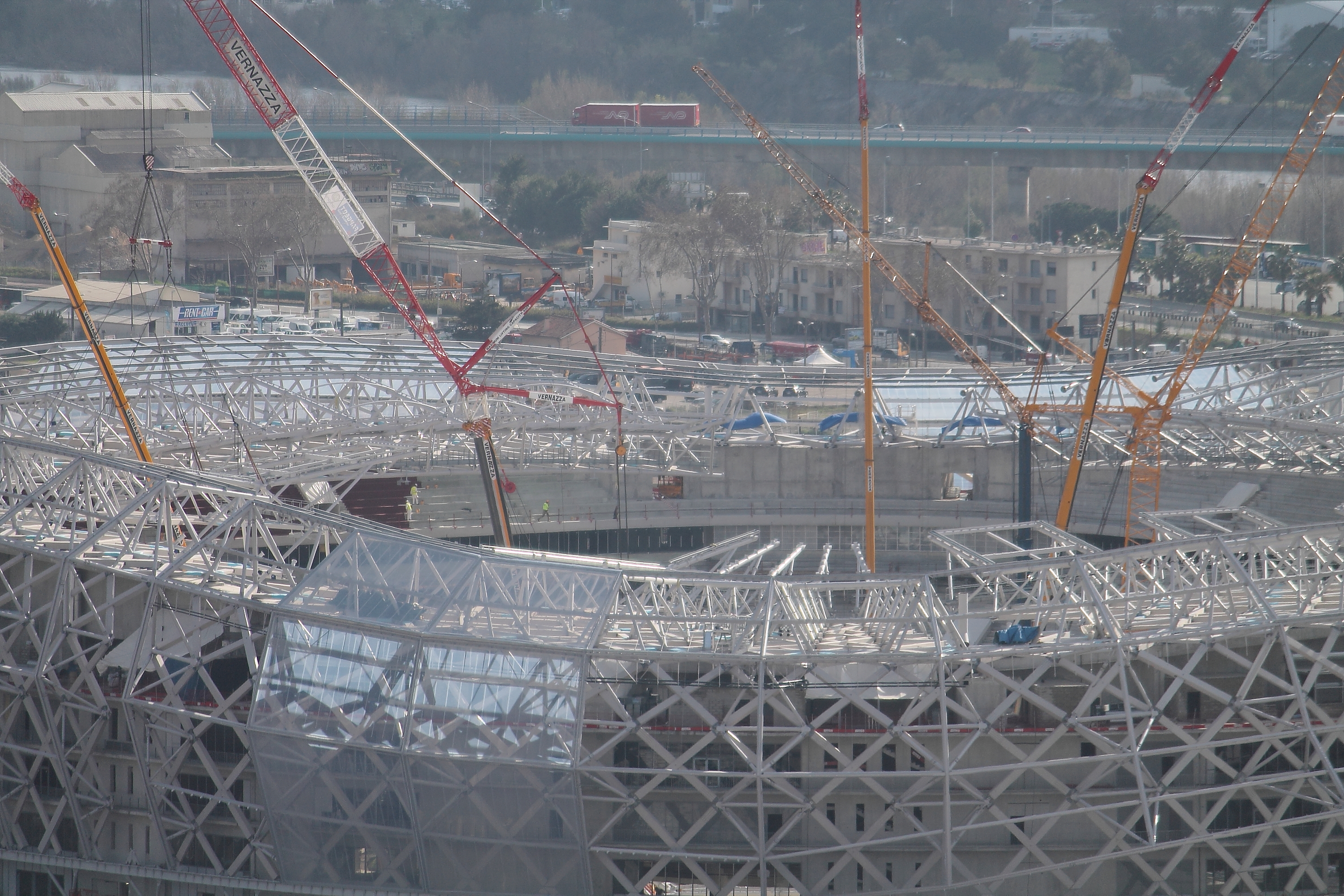 Est bien réfléchissant le plastoque là. Une fois entièrement couvert ce stade va être un diamant. Avec les croisillons en dessous qui resteront apparents ça va être une tuerie de jour..
