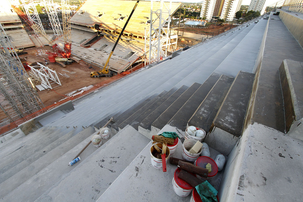 Par contre, même fan de GG "vrai stade à l'anglaise", je préfère de loin à ce stade de Cuiabá, parmi les stades en construcion ou récemment finis, l'Arena du Gremio ou le Castelão à Fortaleza: les gradins y sont presque parallèles au terrain, il y a juste une légère courbure, ce qui rapproche beaucoup les gradins (derrière les buts, milieu des latérales).