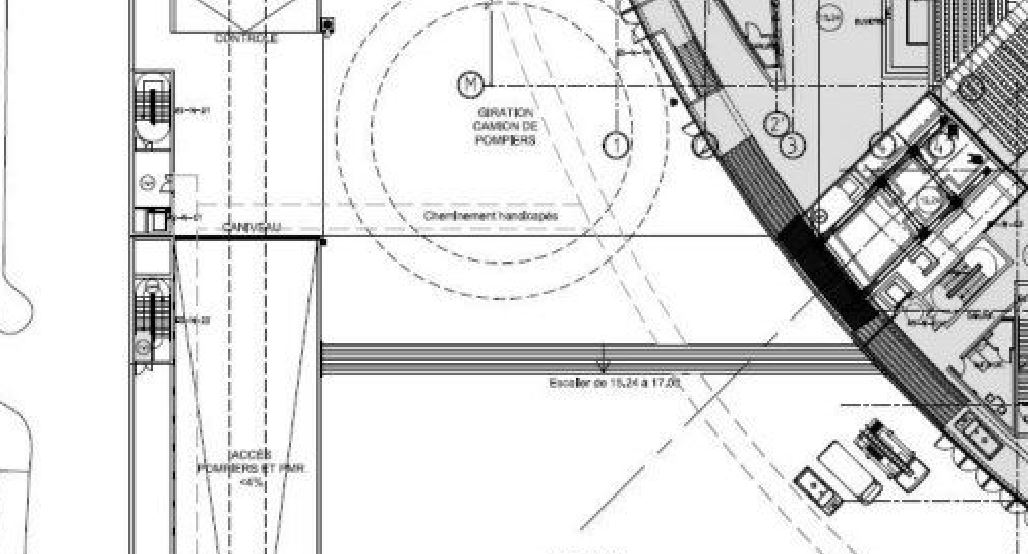 --> D'un autre côté, dans cette zone, figurent des accès du style piétons, sas de sécurité, ascenseur (?) pour monter vers le parvis.