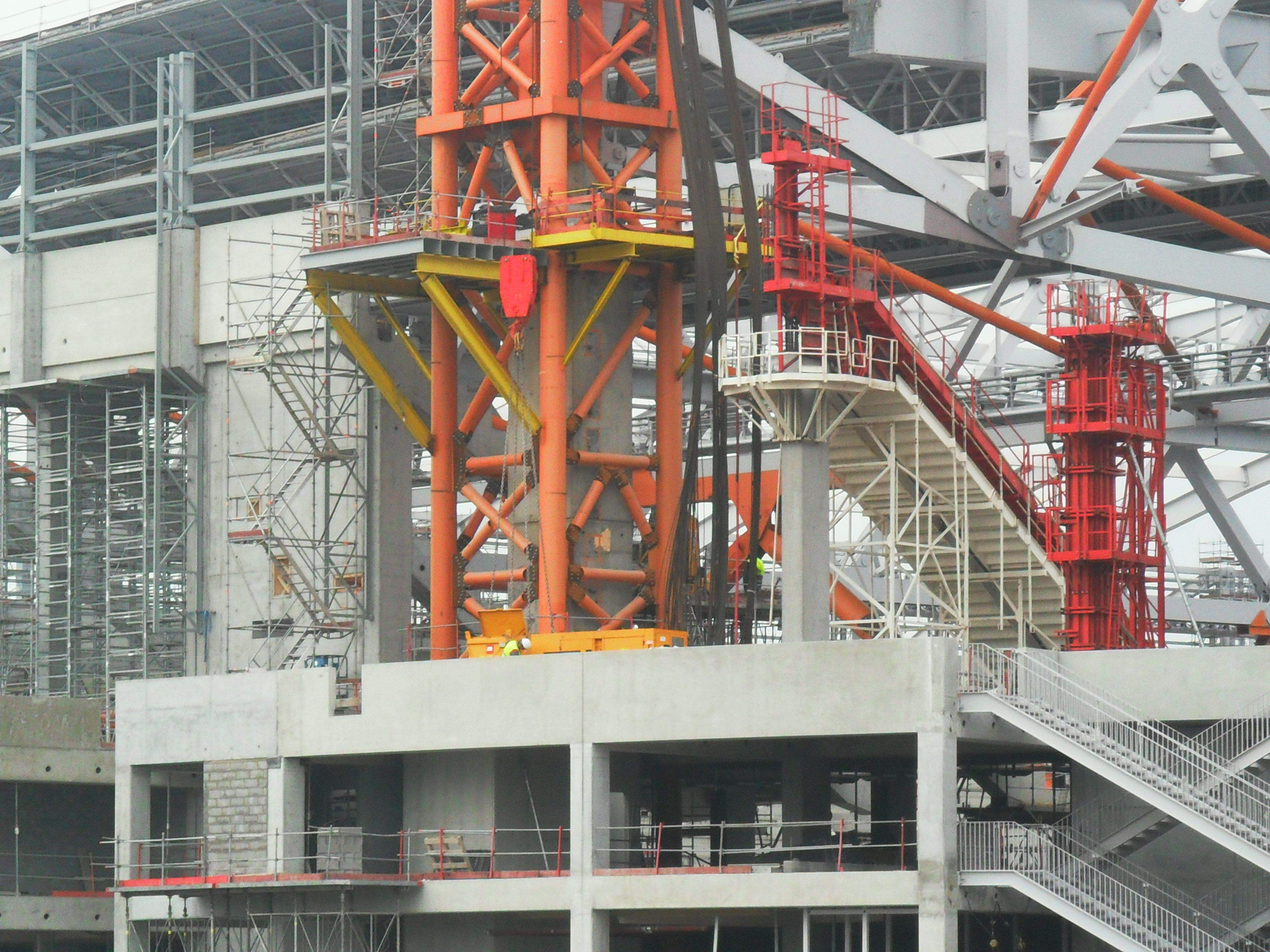 To waddle : ce sont les bardages en dessous de la toiture et qui fera le tour. On en voit un fini ;). les 2 ecrans se trouveront derriere les buts juste en dessous des toitures mobiles .